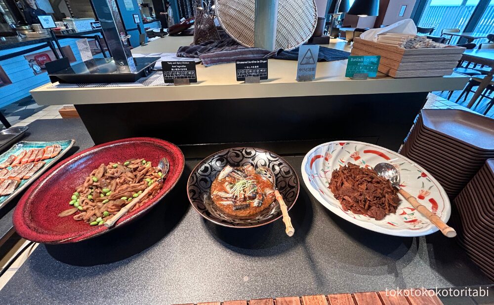 デカフェのアールグレイやアップルほうじ茶などの5種類のティーバッグに、星野リゾートのビュッフェあるあるのカラフルなフレーバーウォーター。爽健美茶は珍しいですね。
