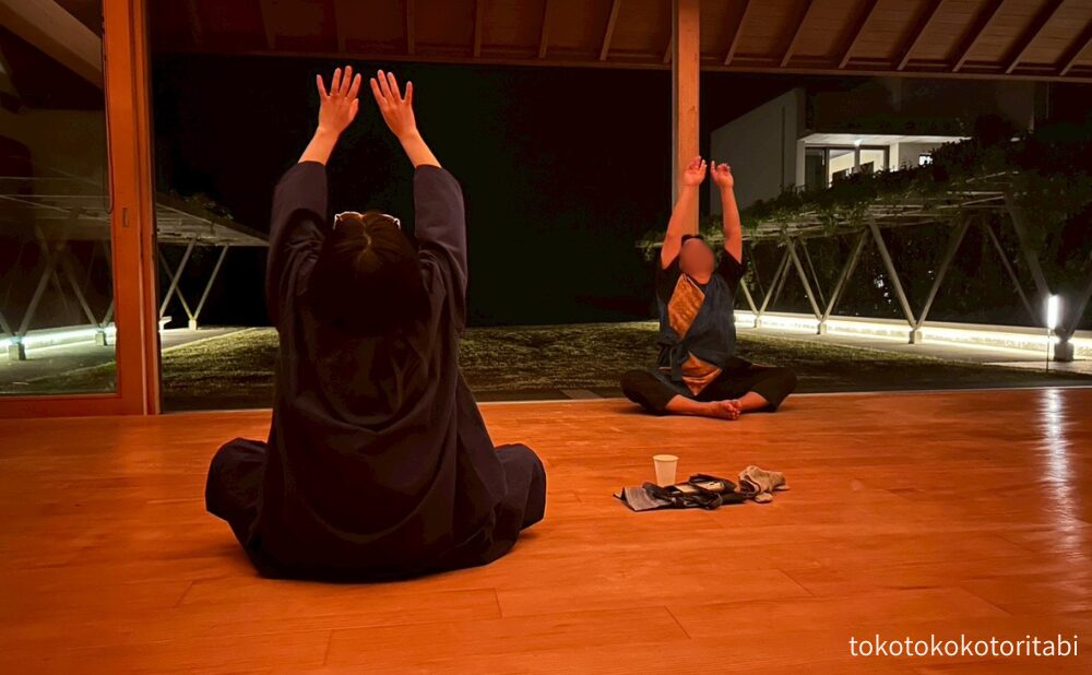 最初は立って行いますが、後半は座って体をほぐしたり、深呼吸したり。眠りに向けて体の力を抜いていきます。