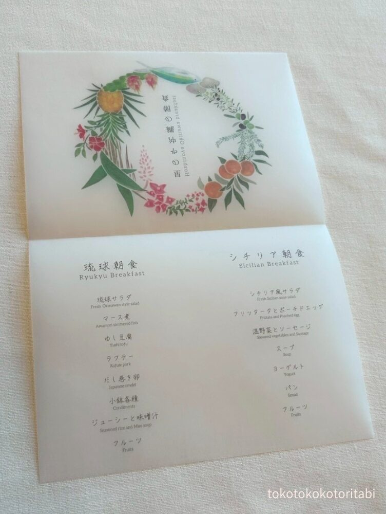 メニューは琉球朝食、シチリア朝食の2種類から選べます。