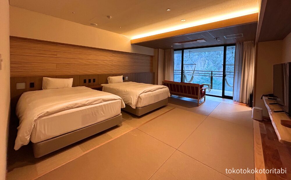 今回宿泊した「ハンモックテラススーペリアツイン」というお部屋は「里山Seyryu」の一室!普段は一番安い部屋を予約するのですが、12月の土曜日ということもあり「温泉倶楽部」のお部屋は空いていなかったので、「里山Seyryu」の中で一番安いお部屋に泊まりました。